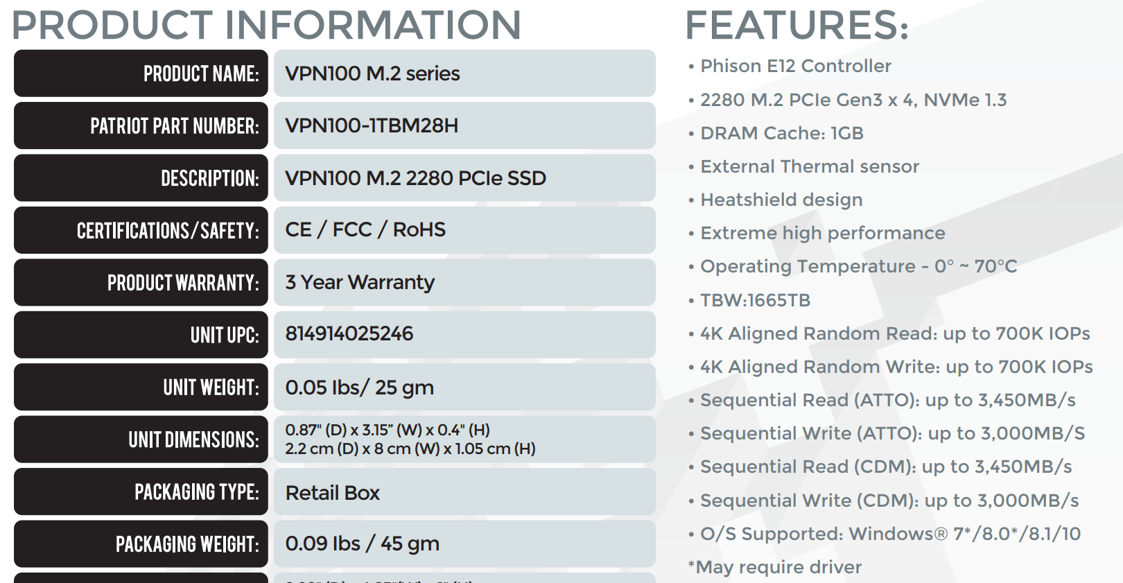 Di seguito riportiamo le specifiche tecniche del Viper VPN100 1TB NVMe SSD; per informazioni più esaustive vi rimandiamo al sito ufficiale dell’azienda (Viper):