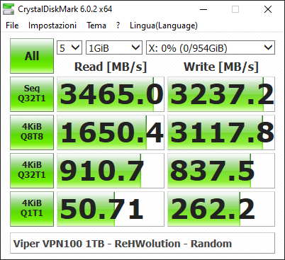 Con CrystalDiskMark, invece, possiamo vedere come le velocità di lettura e scrittura dichiarate non solo siano raggiunte, ma anche ampiamente superate, specie in write, dove il drive in nostro possesso ha raggiunto la strabiliante velocità di 3240MB/s. L’8% più veloce di quello dichiarato. Con file da 4KB, ottime prestazioni, come è lecito aspettarsi dall’abbinamento Phison+Toshiba, gli attuali leader di prestazioni e affidabilità sul mercato.
