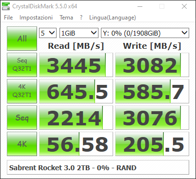 Qui su Anvil, benchmark ben più severo degli altri, rileviamo 2800 MB/s sia in lettura che in scrittura, con i 170K IOPS confermati anche in questo caso con file da 4 KB. Il punteggio finale è di 15819,97, più elevato del 9% rispetto al Sabrent Rocket Q da 2 TB che, sulla carta, presenta velocità di lettura e scrittura superiori a quelle del Rocket 3.0 oggi analizzato.