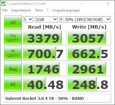 Torniamo su CrystalDiskMark, testando il drive al 50% di capacità: