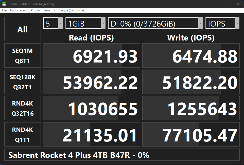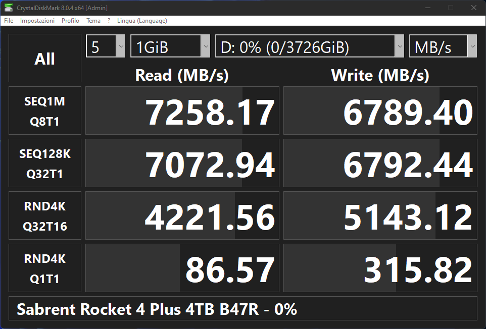La prima cosa che balza all’occhio è il fatto che, al pari delle varianti equipaggiate con Micron 96L, anche in questo caso il Rocket 4 Plus da 2 TB risulti più veloce della versione da 4 TB: raggiungiamo infatti “soltanto” 7250 MB/s in lettura e 6800 MB/s in scrittura, in linea con le specifiche dichiarate e con SSD concorrenti dotati della stessa componentistica, mentre avviene un “pareggio” tra le due capacità in termini di prestazioni con carichi di lavoro ad accesso casuale, con 1M di IOPS in lettura e 1.25M di IOPS in scrittura, equivalenti rispettivamente a 86 MB/s e 316 MB/s. Un netto incremento del 15% rispetto alla versione precedente.