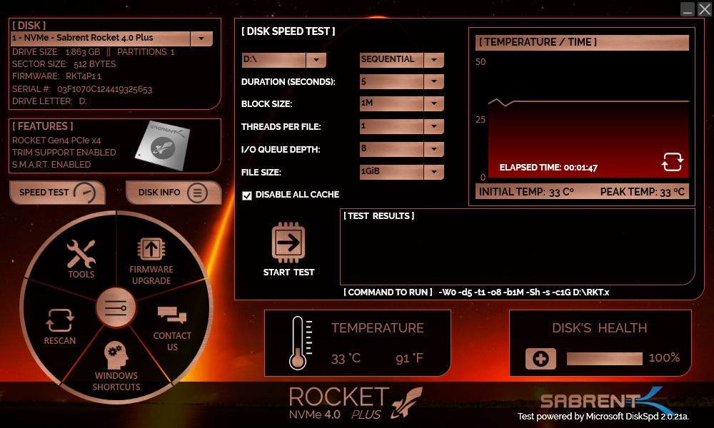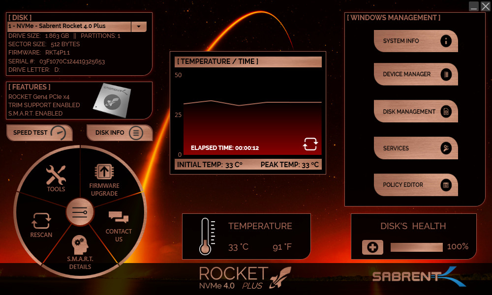 Interessante vedere nell’ultima versione del Rocket Control Panel l’aggiunta di un grafico della temperatura e di uno speed test per verificare le prestazioni del drive.