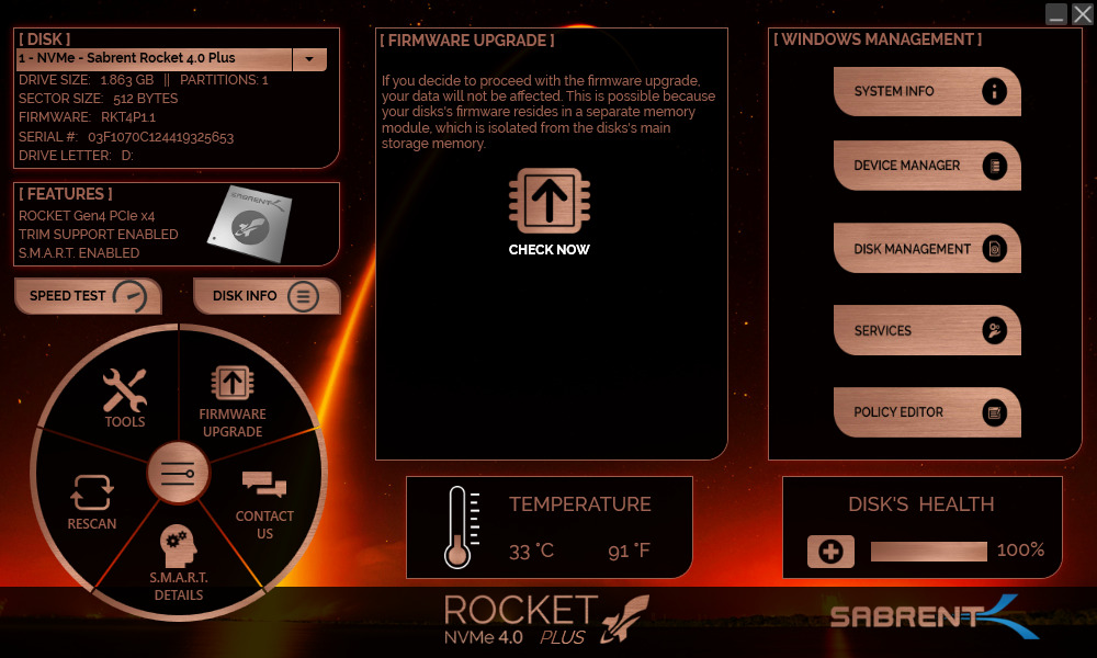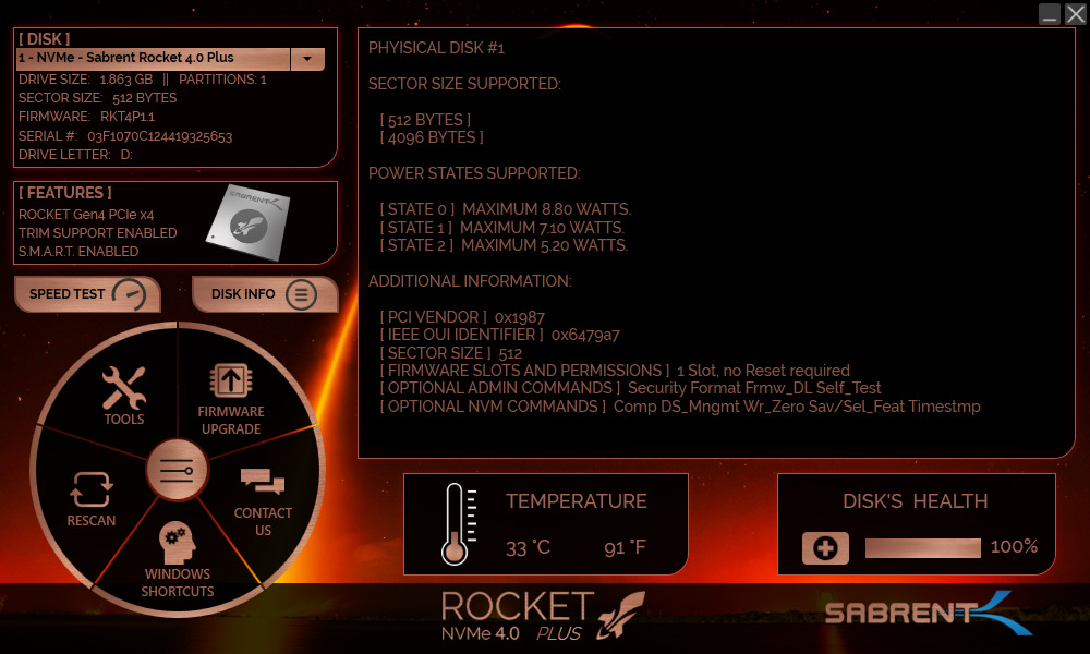 Gli SSD Sabrent sono muniti di due utility per la gestione drive: il Rocket Control Panel ed il Sector Size Changer. Come lascia intendere il nome, il secondo servirà a cambiare la dimensione dei settori del drive; il primo software, invece, è il centro di controllo di tutti i parametri vitali degli SSD Sabrent, con la possibilità di monitorare la temperatura, lo stato dello S.M.A.R.T., aggiornare il firmware e verificare lo stato di salute dell’SSD.