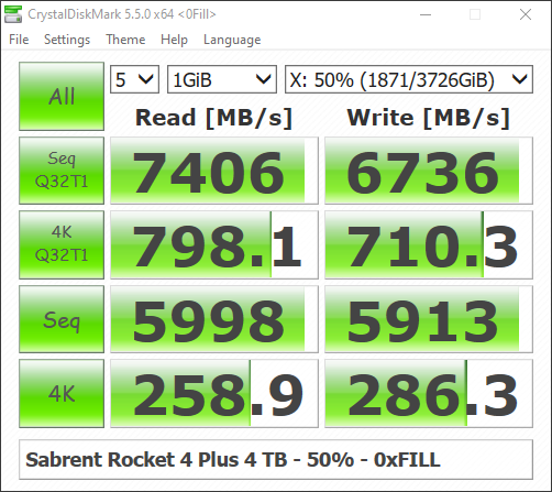 Nulla da dire sulle prestazioni del drive, che rimangono praticamente inalterate nonostante sia disponibile soltanto la metà dello spazio a disposizione. Più di 7 GB/s in lettura e ben 6.4 GB/s in scrittura. Notiamo un insolito calo di prestazioni con file da 64 MB, ma probabilmente si tratta di un errore casuale, visto che eseguendo più volte il benchmark, le prestazioni si riallineano a quanto rilevato con le altre dimensioni.
