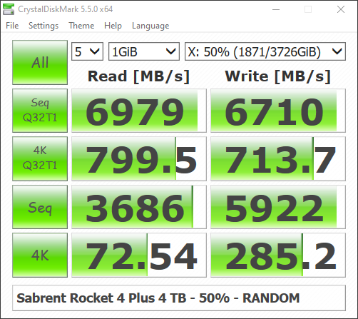 Torniamo su CrystalDiskMark, testando il drive al 50% di capacità: