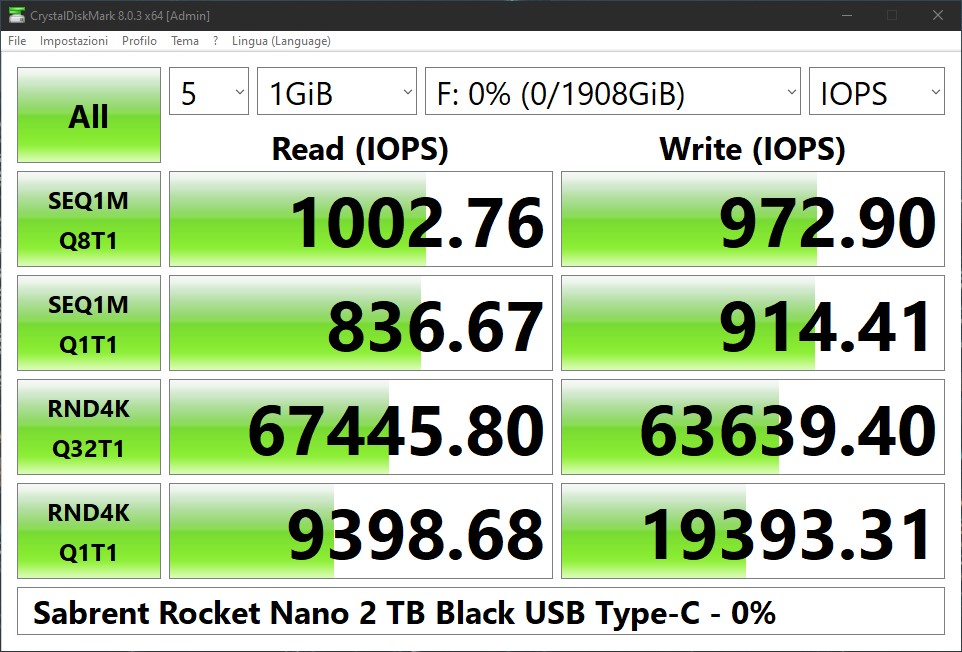 A differenza della versione precedente, Crystal Disk Mark 8 riesce con successo a validare le dichiarazioni del brand, ottenendo ben 1050 MB/s in lettura e 1020 MB/s in scrittura, garantendo inoltre ottimi risultati (per un drive su bus USB) anche con file casuali da 4 KB registrando più di 60K IOPS in entrambi i campi.