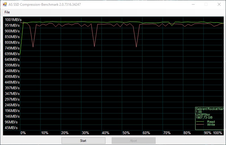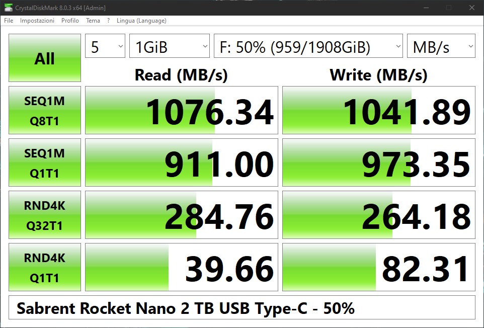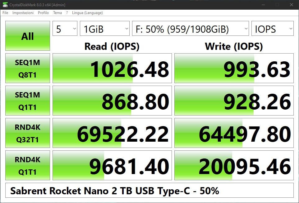 Anche in questo caso un leggero calo prestazionale, quantificabile in meno del 2%, in termini di velocità di scrittura, mentre con i suoi 1009 MB/s la lettura non subisce variazioni di alcun tipo. Il controller, nonostante sia un semplice Phison E13T ottimizzato più per il risparmio energetico che per le prestazioni, riesce a gestire lo spazio libero in maniera ottimale, garantendo prestazioni elevate nonostante sia già presente circa 1 TB di dati sul Rocket Nano.
