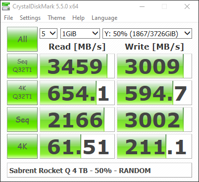 Torniamo su CrystalDiskMark, testando il drive al 50% di capacità: