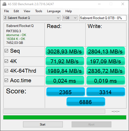 AS SSD è uno dei due test più impegnativi nella nostra piccola ma efficace suite di benchmark, e lo si nota dal punteggio di circa 6900 punti raggiunto dal Rocket Q da 8 TB: si tratta del miglior score ottenuto da un drive PCIe 3.0, ma siamo lontani anche dal peggiore dei drive basati sulla versione 4.0 dello standard.