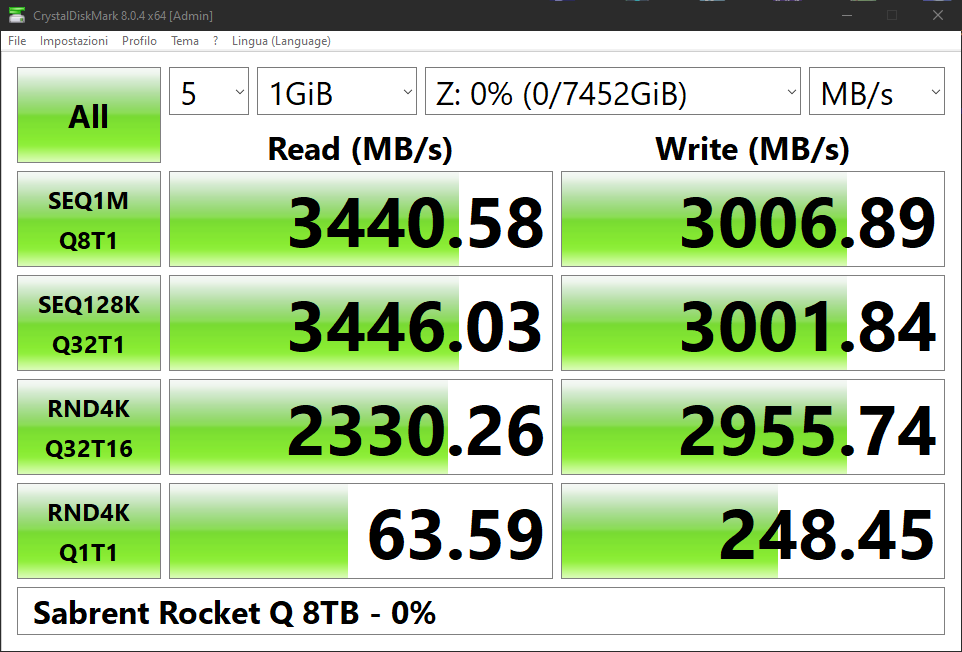 Questa recensione vede l’introduzione di Crystal Disk Mark aggiornato alla versione 8.0.4, la più recente messa a disposizione da Crystal Dew World e capace di spremere al massimo gli SSD testati con esso, cosa spesso non raggiungibile dalle versioni precedenti in quanto poco ottimizzate per le piattaforme più recenti: