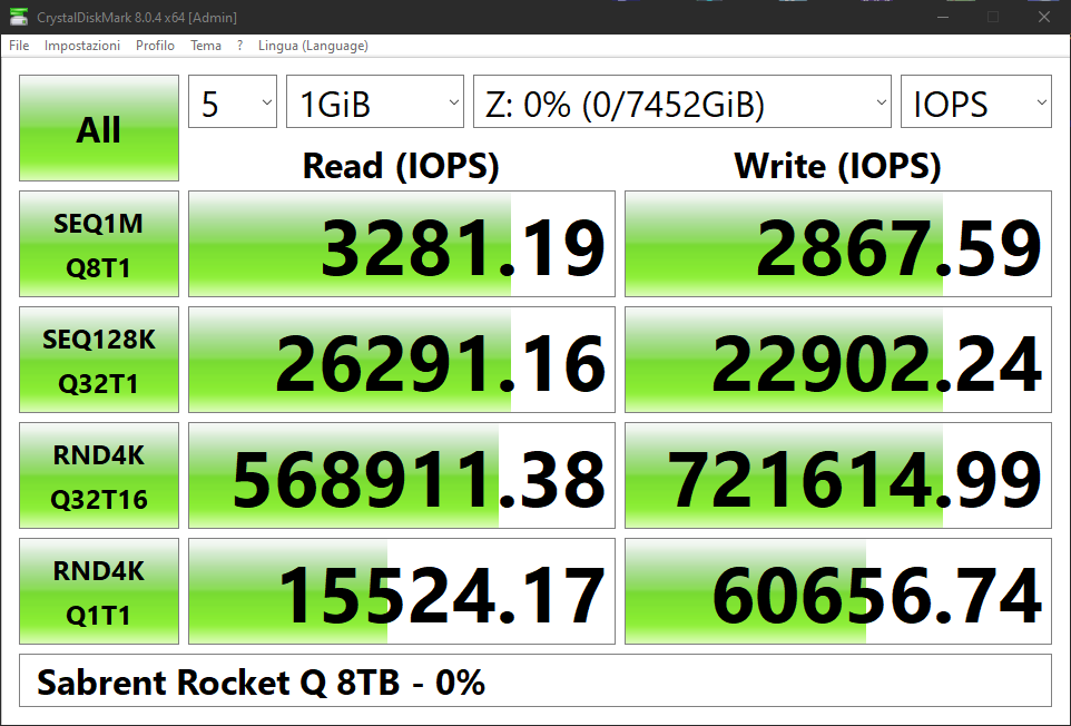 Risultati simili a quelli ottenuti con la versione 5.5.0 del programma, e in questo caso validiamo i risultati con file da 4 KB dichiarati da sabrent: nella terza riga, infatti, potete vedere come il drive raggiunga 568K IOPS in lettura (contro le 550K dichiarate) e 721K IOPS in scrittura (contro le 680K dichiarate), superando ancora una volta le aspettative.