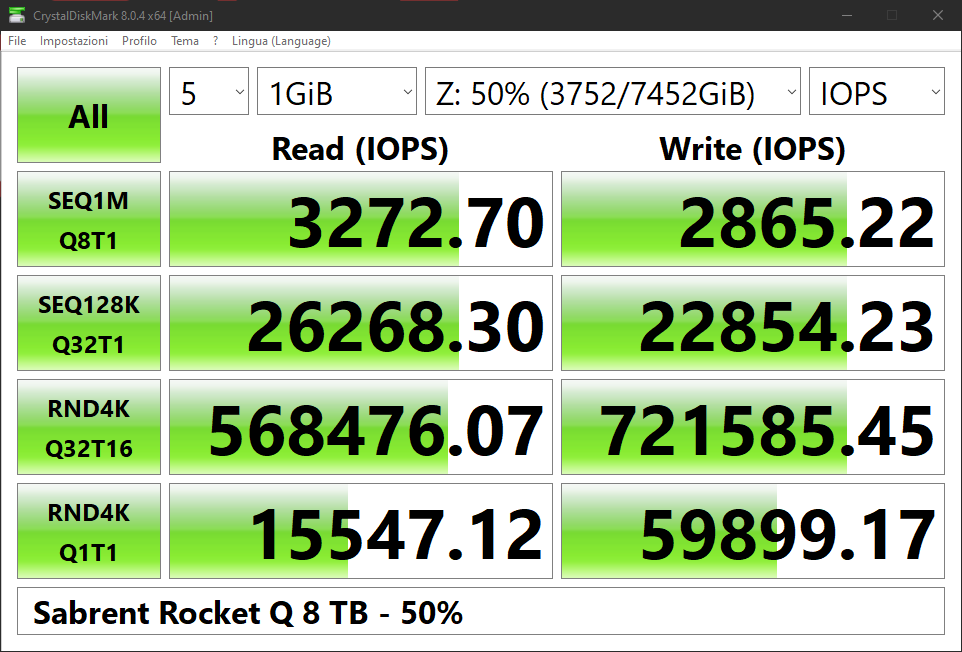 Torniamo su CrystalDiskMark 5.5.0, testando il drive al 50% di capacità: