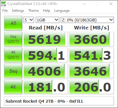 Con questo benchmark, vediamo come il drive riesca a totalizzare prestazioni in lettura superiori a 5 GB/s, mentre sul fronte della scrittura questo drive si piazza esattamente a metà strada tra il Sabrent Rocket 3.0 ed il Sabrent Rocket 4.0, con circa 3.5 GB/s nel migliore degli scenari.
