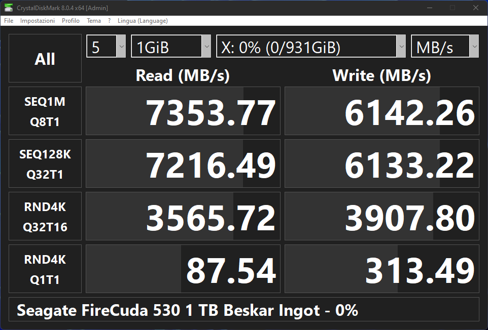 Sorprendenti le prestazioni per un drive da 1 TB: più di 7300 MB/s in lettura e più di 6000 MB/s in scrittura sul fronte delle velocità sequenziali, superando i 7300/6000 MB/s dichiarati dal produttore. Con file da 4 KB raggiungiamo ben 87.5 MB/s, con 870K IOPS in lettura e 954K IOPS in scrittura, rispettivamente più elevati e più bassi dei valori presenti nelle specifiche.