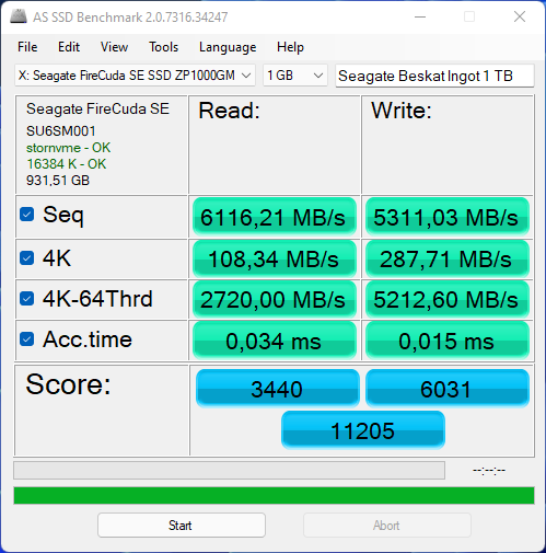 Incredibilmente (ma non troppo, visto il tipo di NAND e il controller utilizzati), il FireCuda 530 Beskar Ingot SE totalizza la stessa identica velocità di copia dei Sabrent Rocket 4 Plus: più di 3 GB/s sono un risultato davvero ottimo, considerando che questo test effettua simultaneamente operazioni di lettura e scrittura sul drive stesso.