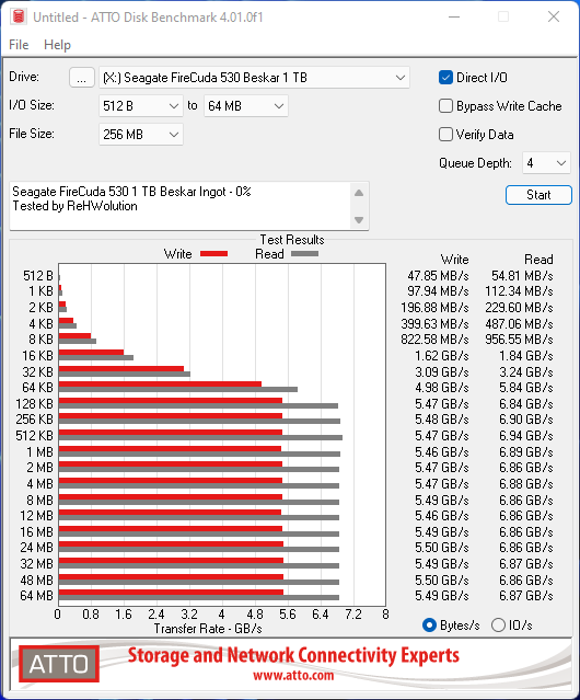 Utilizziamo in seguito ATTO Disk Benchmark, che dalla versione 4.00 risulta essere un ottimo software per testare le prestazioni in uno scenario più o meno realistico, anche se da quando è stato aggiornato è difficile ottenere nel software i valori dichiarati dai produttori, complice il fatto che la versione precedente era troppo teorica e poco indice delle reali prestazioni di un drive: