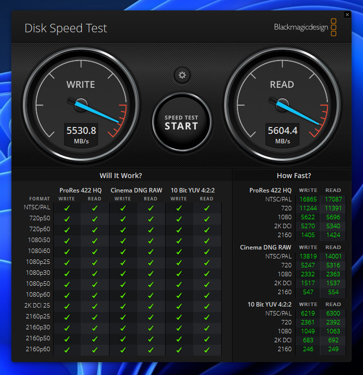 Blackmagic è un’azienda australiana che non ha certo bisogno di presentazioni nel campo della produzione video, sia sul fronte delle videocamere che del software di editing, DaVinci Resolve. Proprio quest’ultimo dispone di un test prestazionale integrato che consente di analizzare le performance dei drive testati con una vasta gamma di codec, risoluzioni e bitrate: