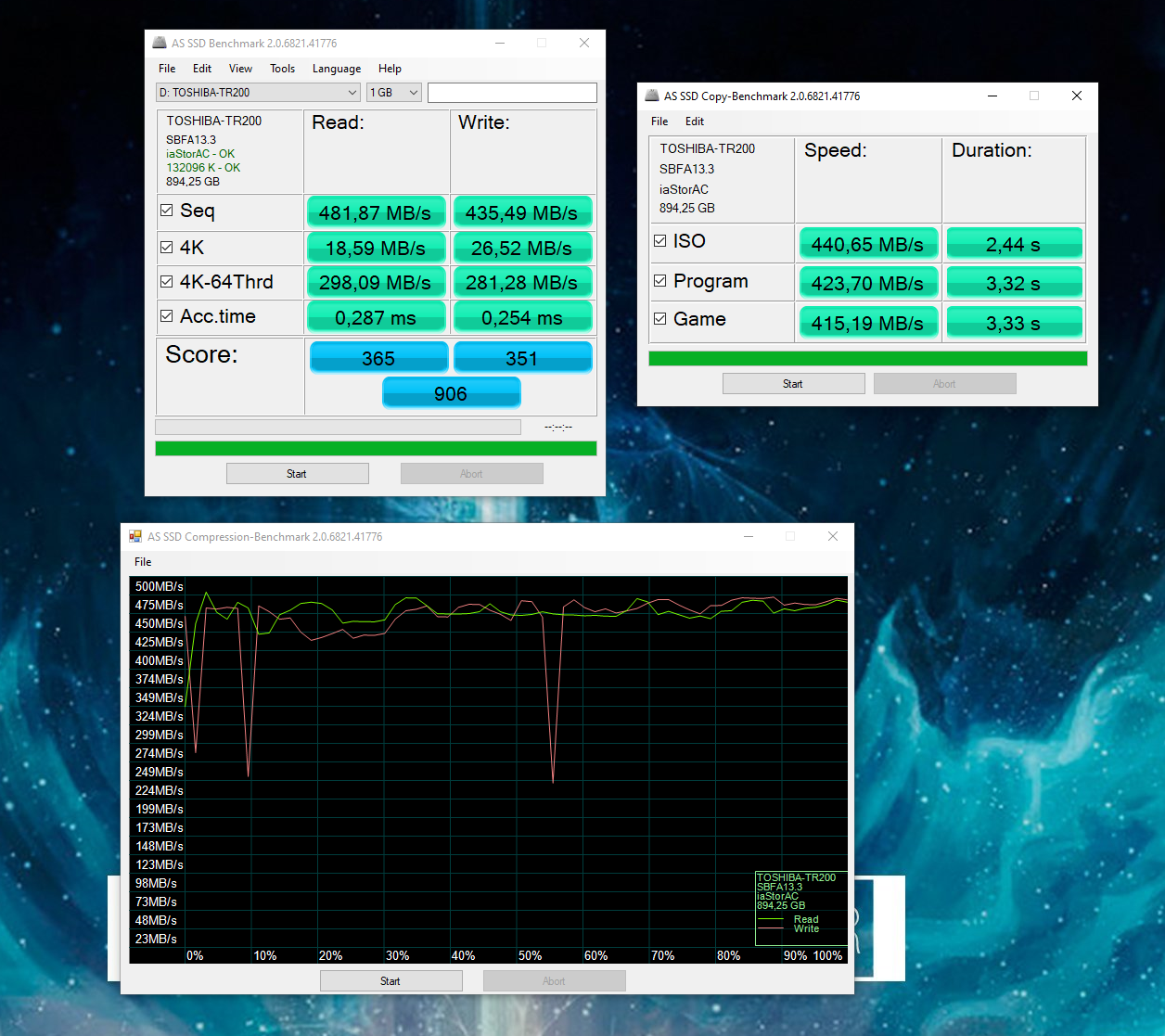 Molto più duro è il benchmark, o meglio la suite di test, AS SSD, che è parecchio lontano da quanto dichiarato dall’azienda, ma che nei test secondari di Copy e Compression si comporta benissimo, facendo segnare quasi 500 MB/s in lettura e scrittura in quest’ultimo, mentre nel primo i valori sono eccellenti per un SSD SATA da 2.5″.