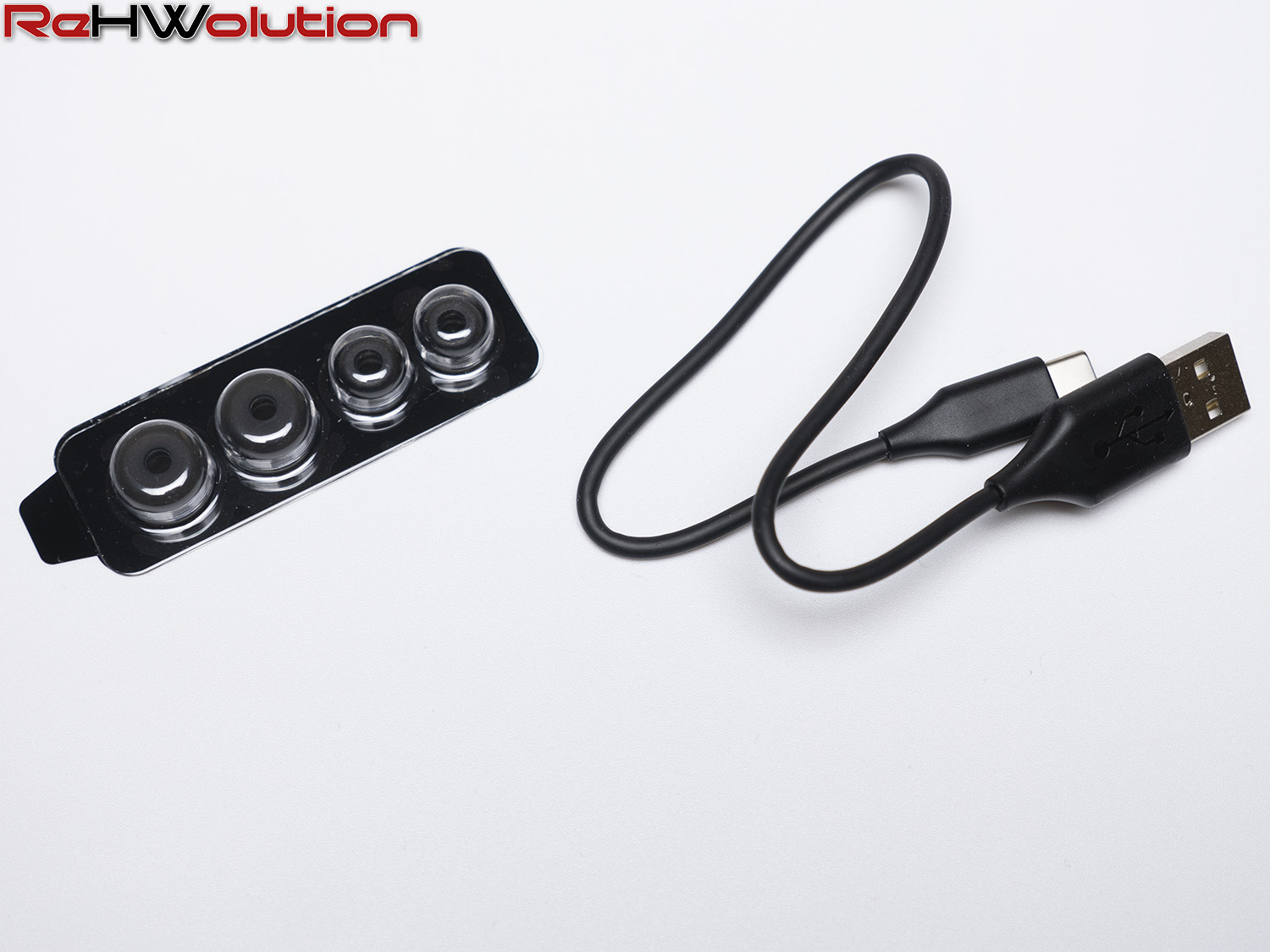 All’interno della confezione troviamo le cuffie, il case per la ricarica, i gommini di varie dimensioni ed un cavo USB Type-C dalla lunghezza contenuta per consentire la ricarica del case tramite la porta presente sul retro.
