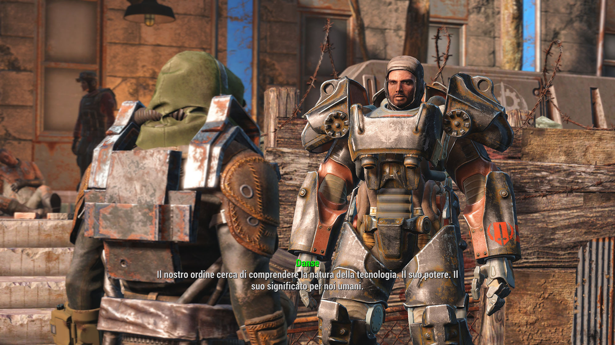 I fissati con la tecnologia nella sua forma più pura, ovvero come ausilio all’umanità, e non come sostituzione di essa. Formata da una rigida struttura gerarchica, la CdA (come viene abbreviata anche nel gioco) è la seconda fazione che incontreremo nel gioco, e ci permetterà di avere accesso a tante armi e, più in avanti, ad una versione avanzata dell’armatura atomica. Il loro scopo è recuperare artefatti tecnologici pre-bellici (ovvero risalenti a prima dell’anno 2077) ed eradicare la minaccia dei “sintetici”, che oggi noi chiameremmo semplicemente androidi: robot con sembianze umane che cercano di soppiantare la razza umana, o almeno questo è quello che ci dicono.